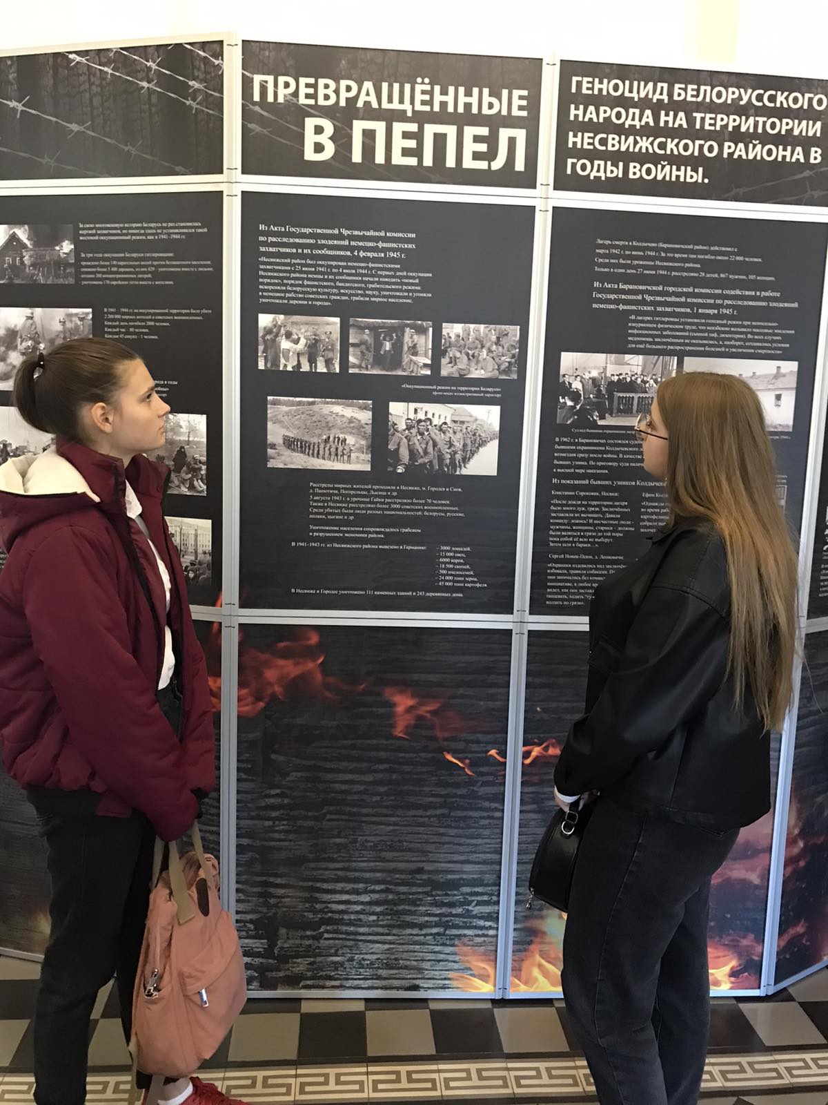 В год исторической памяти учащиеся Н-12 группы посетили экспозицию «Превращенные в пепел. Геноцид белорусского народа на территории Несвижского района в годы войны» в Национальном историко-культурном музее-заповеднике «Несвиж». Учащиеся познакомились с историческими документами, разоблачающими страшные преступления нацистов и их пособников в годы Великой Отечественной войны. Подвиг тех, кто одолел фашизм, бессмертен.