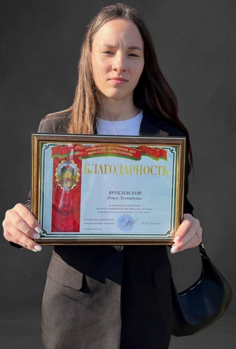 04 октября в УВД Минского облисполкома прошла акция "День открытых дверей". В ней приняли участие члены молодежного отряда охраны правопорядка нашего колледжа. В качестве лучших представителей отряда были приглашены учащиеся Ф-33 группы Врублевская Ольга и Федюков Александр. По итогам работы благодарностью "За активное содействие органам внутренних дел Минской области в выполнении возложенных на них задач" была награждена Врублевская Ольга Леонидовна.