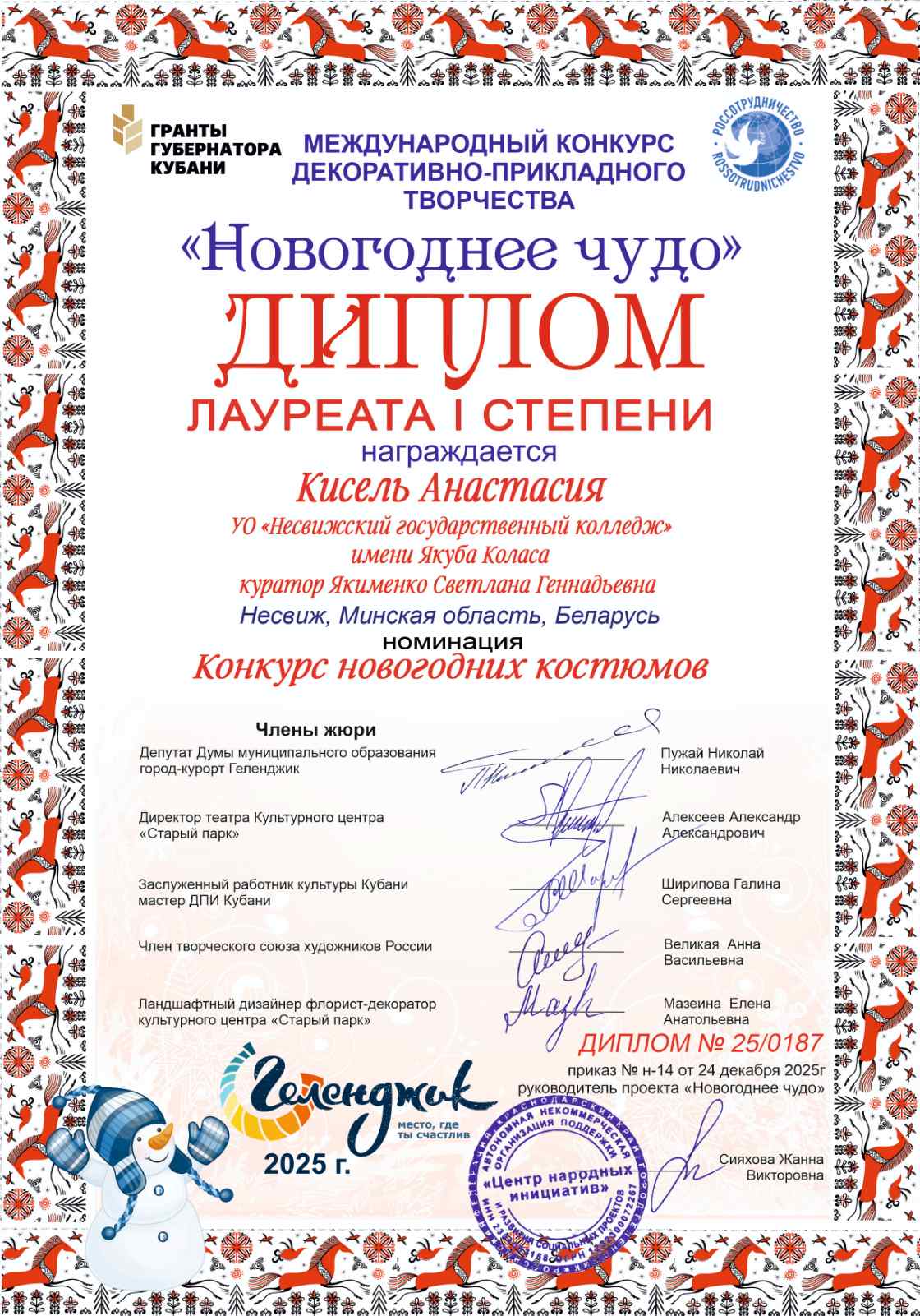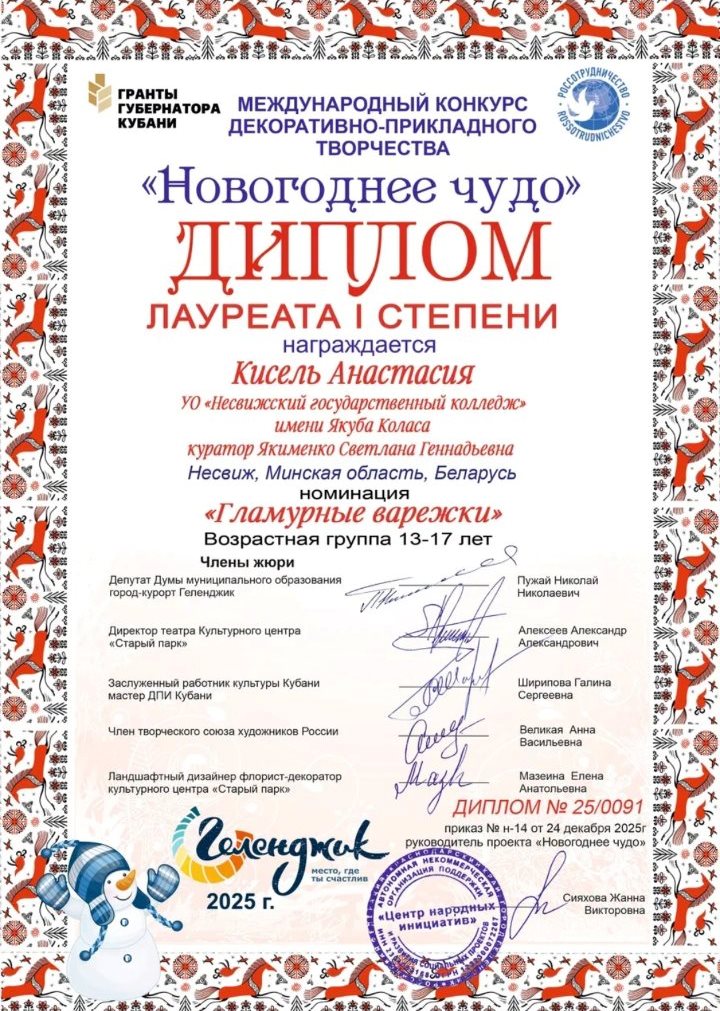 Поздравляем Анастасию Кисель, учащуюся группы Г-17 - лауреата Международного конкурса прикладного творчества Новогоднее чудо – 2025! Настя стала обладательницей двух дипломов 1 степени. В номинации "Новогодний костюм" и в номинации "гламурные варежки". Поздравляем Анастасию и желаем ей новых творческих успехов!